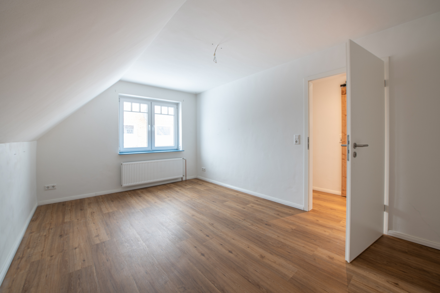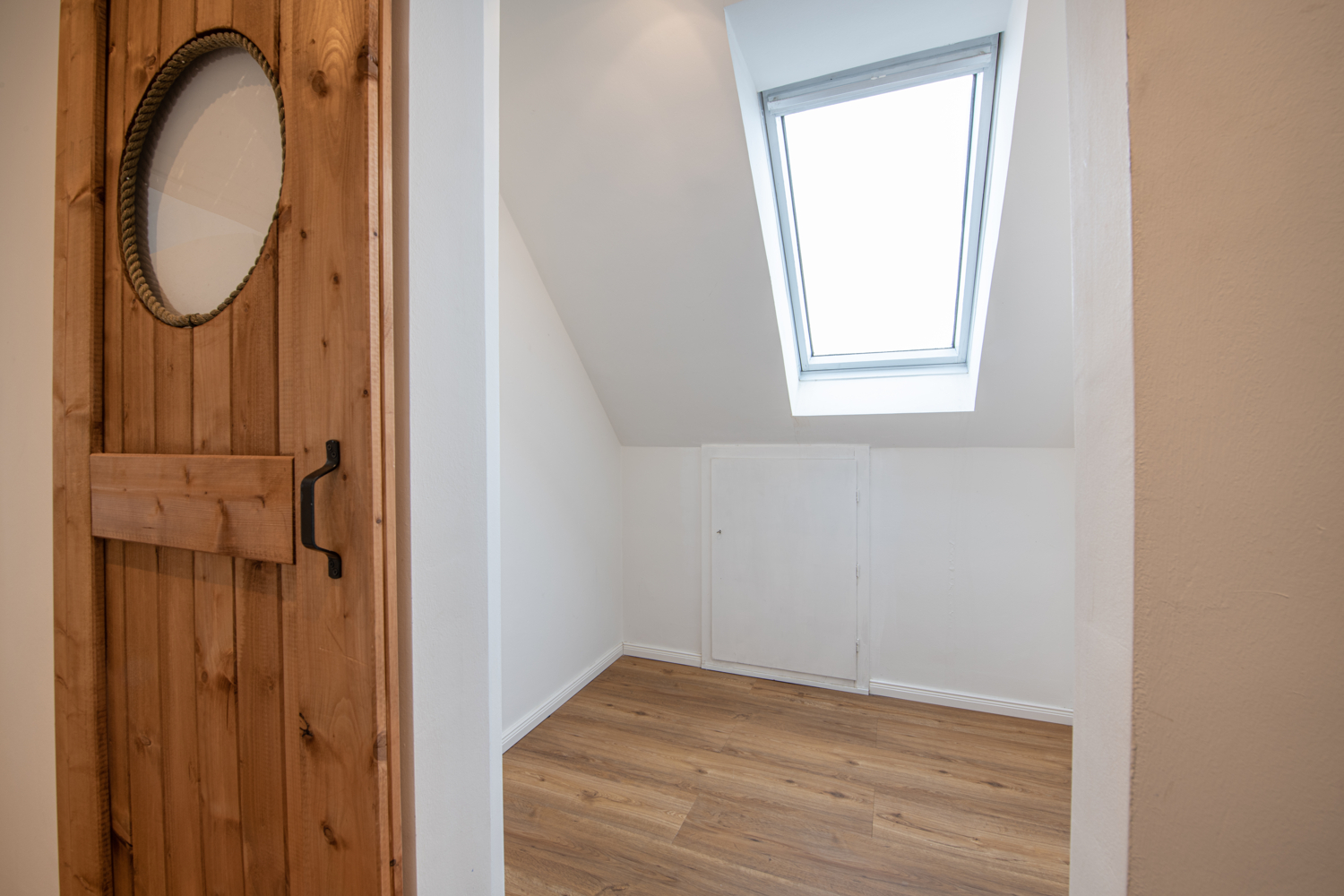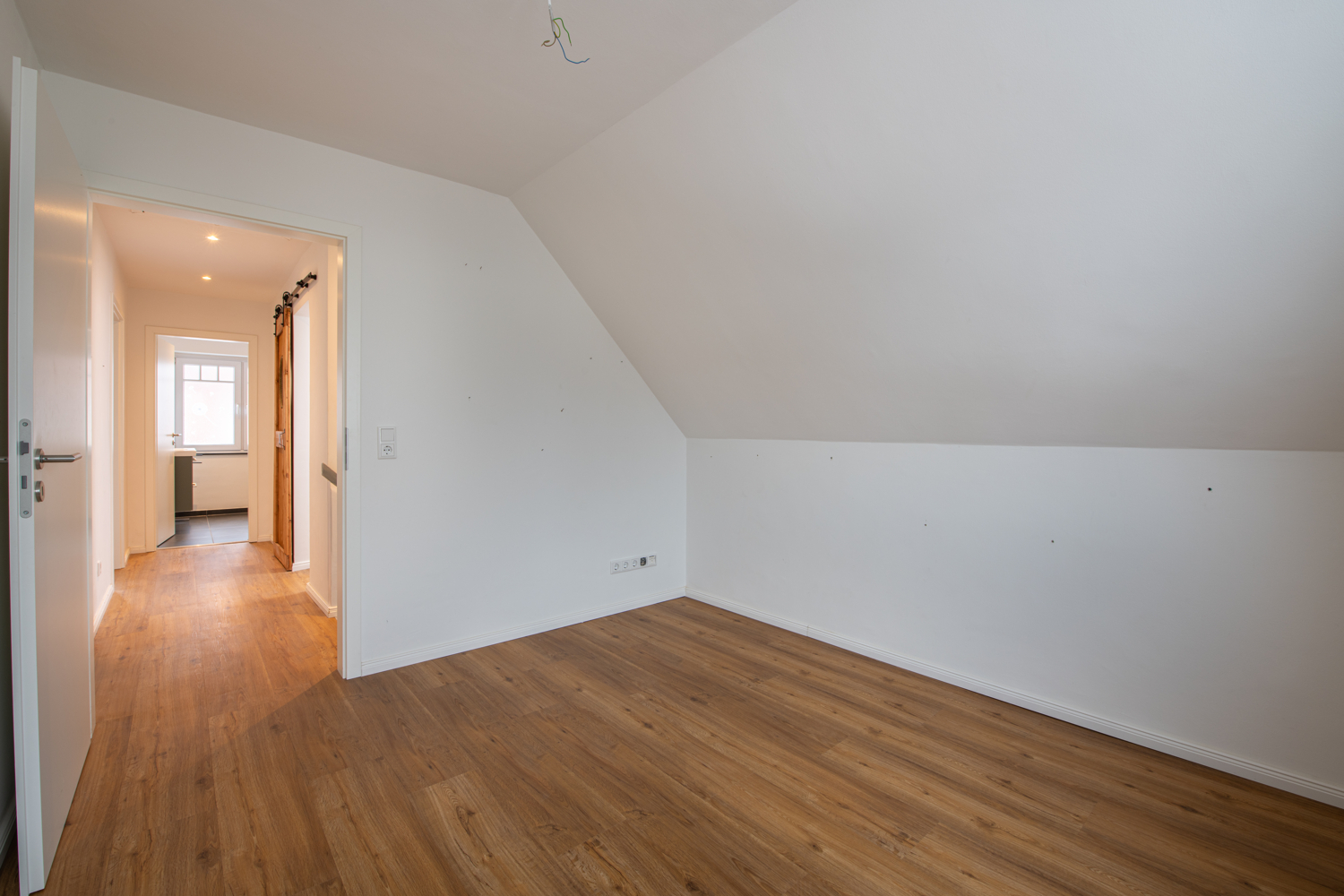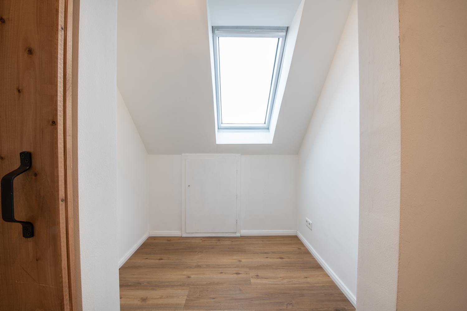 Im Dachgeschoss befindet sich das große Elternschlafzimmer mit Balkon (ca. 4x1m) sowie ein kleineres und ein etwas größeres Kinderzimmer sowie ein Reduit für Dies & Das mit Kniestockluke, Dachfenster und einer schicken Schiebetür davor. Den Balkon beim Elternschlafzimmer können Sie nach Ihren persönlichen Vorstellungen gestalten oder einfach geschlossen halten. Mein persönlicher Favorit wären 3 (2 für die Seiten, 1 für die Front) Eternitplatten in Anthrazit gehalten, die direkt ans bestehende Geländer geschraubt werden. Alle Zimmer im Dachgeschoss sind hell und freundlich gestaltet. Der moderne Bodenbelag und die jeweils großen Fenster lassen zu wünschen nicht wirklich etwas übrig.