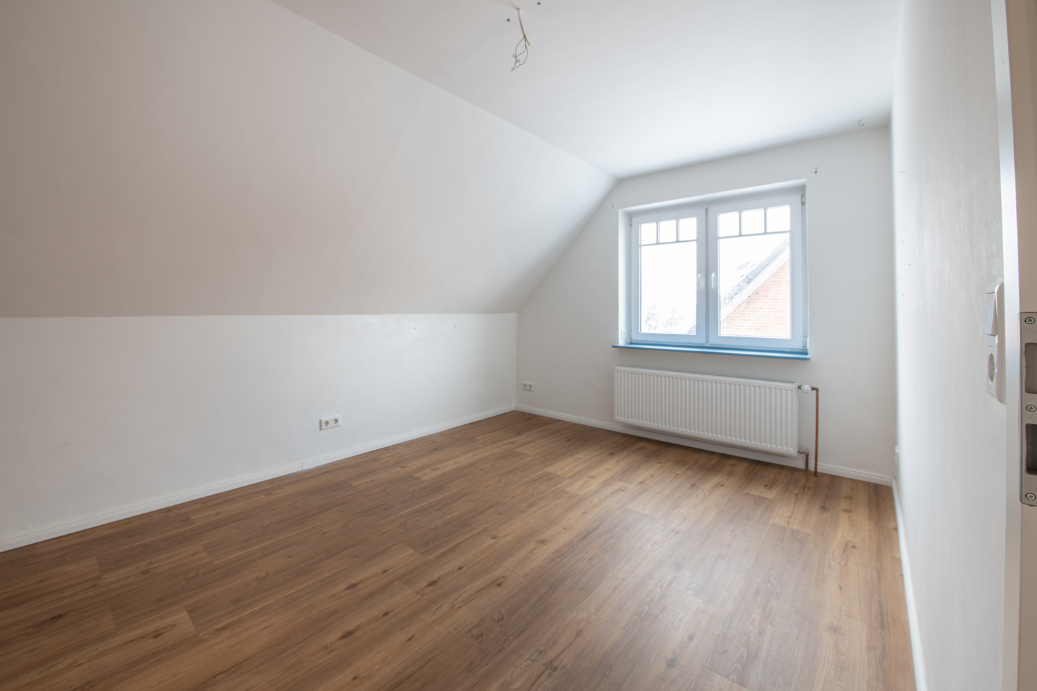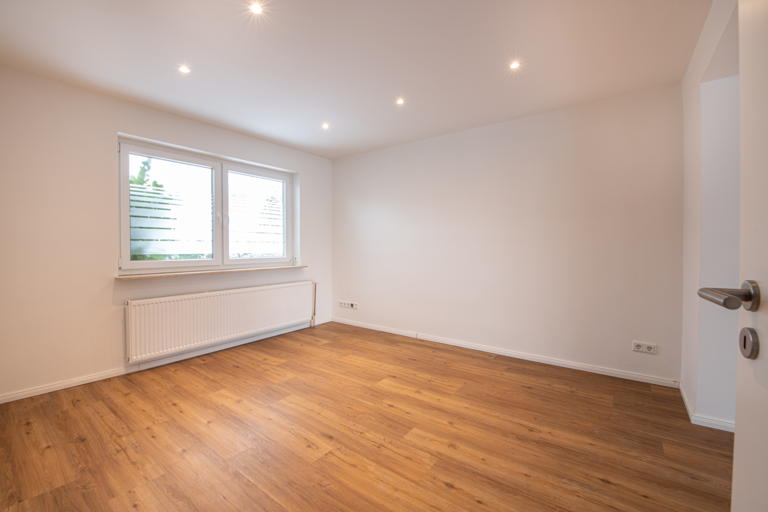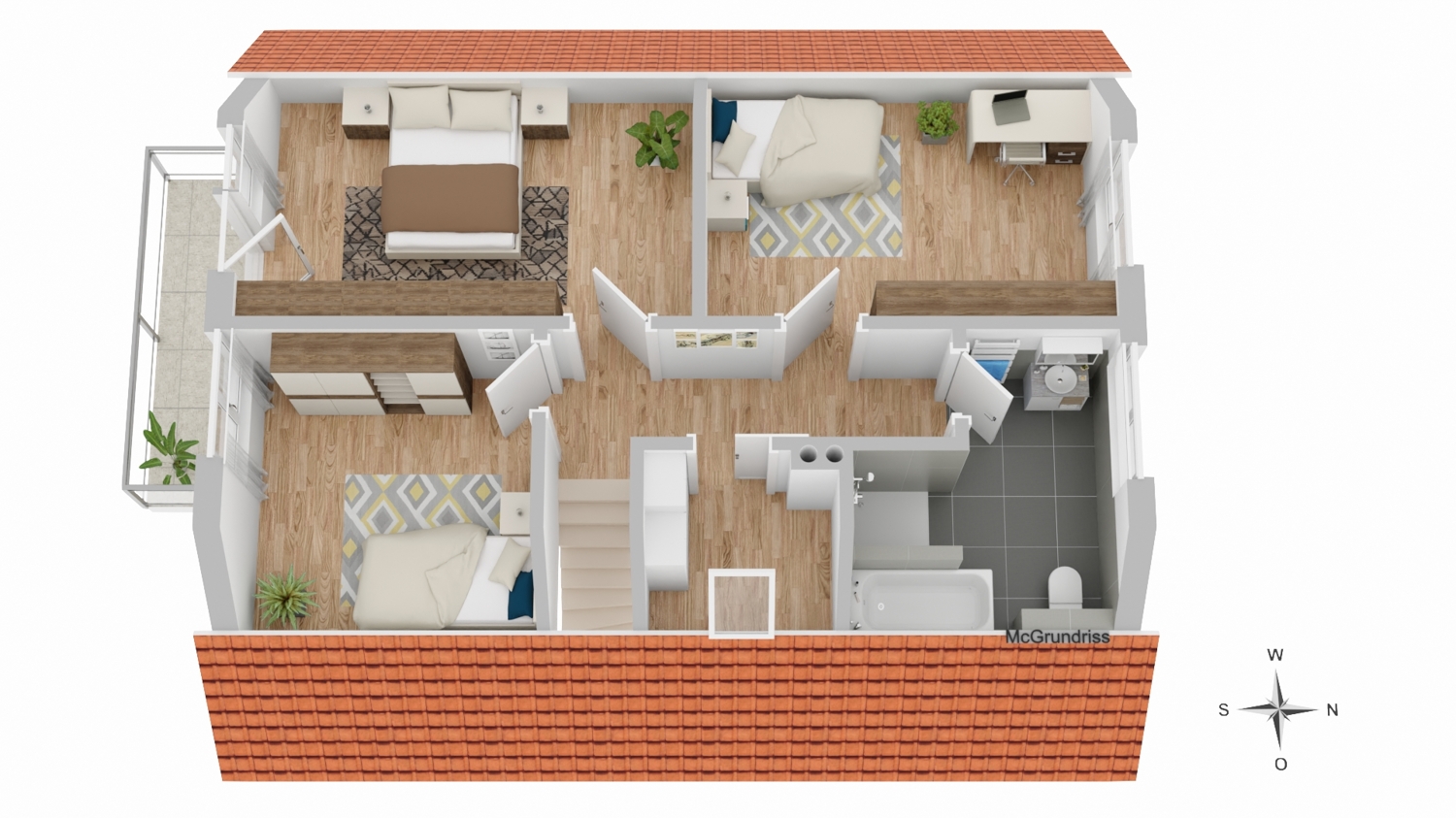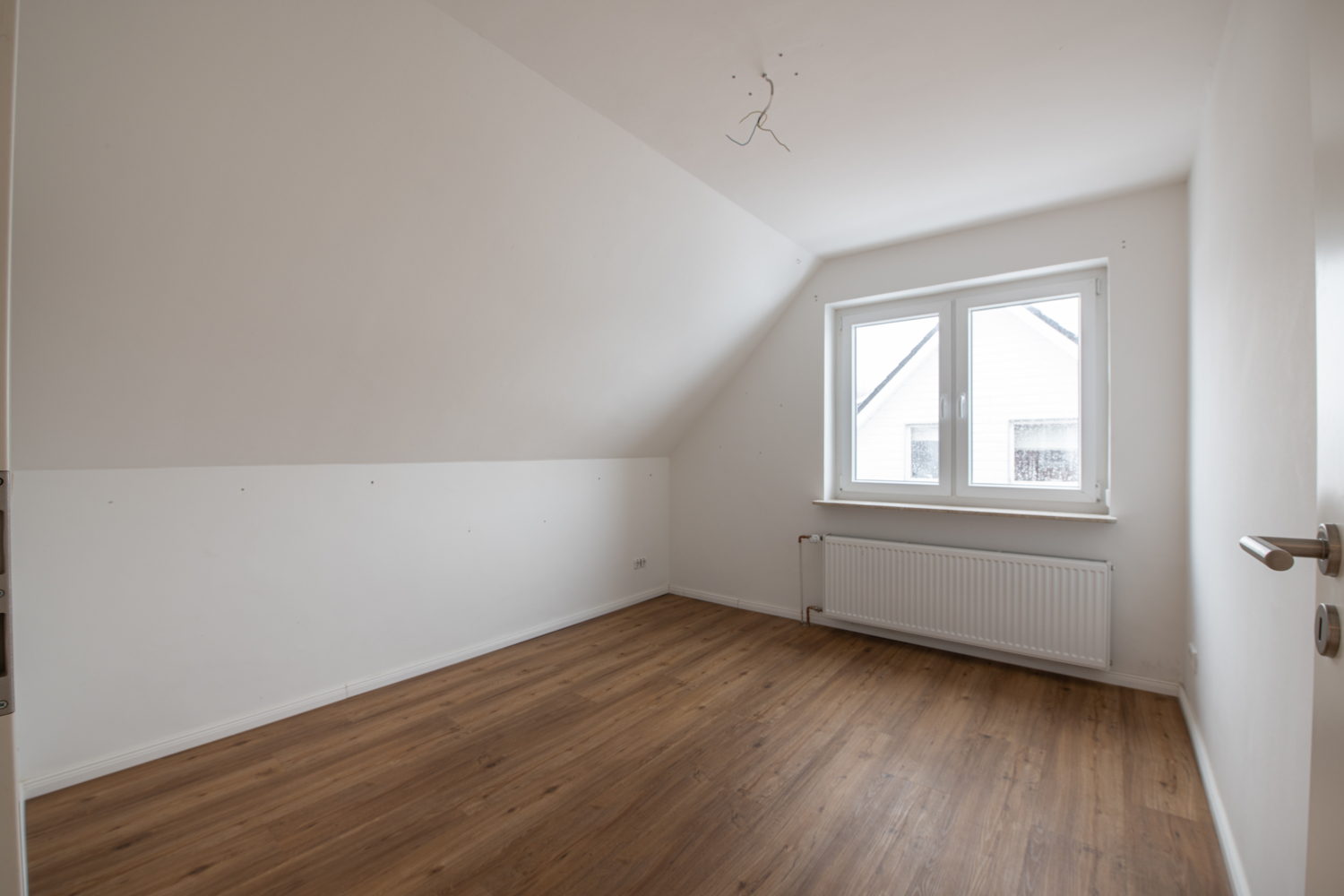 Im Dachgeschoss befindet sich das große Elternschlafzimmer mit Balkon (ca. 4x1m) sowie ein kleineres und ein etwas größeres Kinderzimmer sowie ein Reduit für Dies & Das mit Kniestockluke, Dachfenster und einer schicken Schiebetür davor. Den Balkon beim Elternschlafzimmer können Sie nach Ihren persönlichen Vorstellungen gestalten oder einfach geschlossen halten. Mein persönlicher Favorit wären 3 (2 für die Seiten, 1 für die Front) Eternitplatten in Anthrazit gehalten, die direkt ans bestehende Geländer geschraubt werden. Alle Zimmer im Dachgeschoss sind hell und freundlich gestaltet. Der moderne Bodenbelag und die jeweils großen Fenster lassen zu wünschen nicht wirklich etwas übrig.