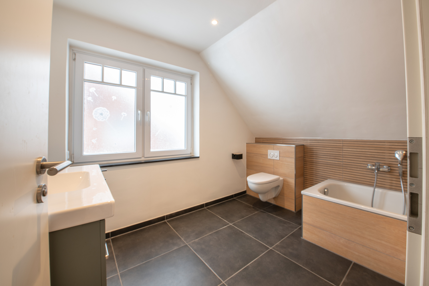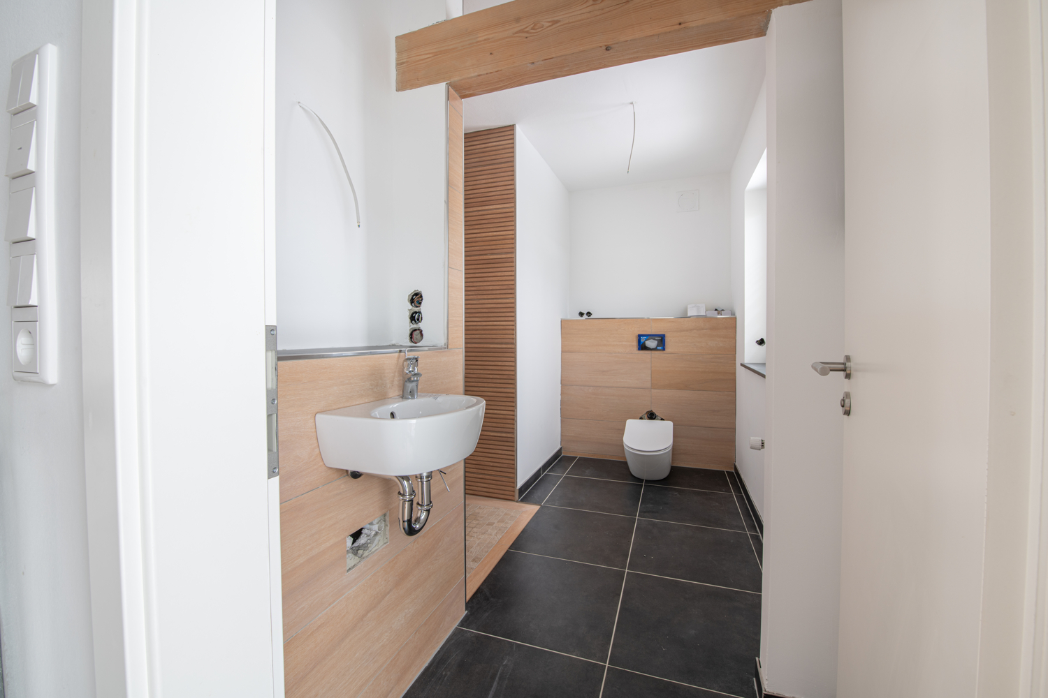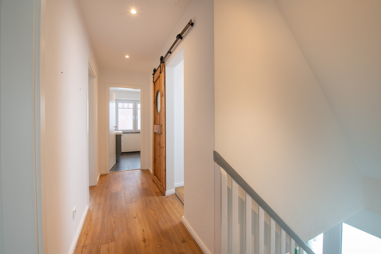 Angekommen im Eingangsbereich des Erdgeschosses freuen Sie sich einmal mehr an dem vielen Licht, dass aus allen Luken ins Haus zu strömen scheint. Der Flur ist geräumig und bietet neuerdings direkt neben der Haupteingangstür direkt zur Rechten ein vollwertiges Badezimmer (Baujahr 2025/26) mit Waschtisch, Dusche und Toilette.