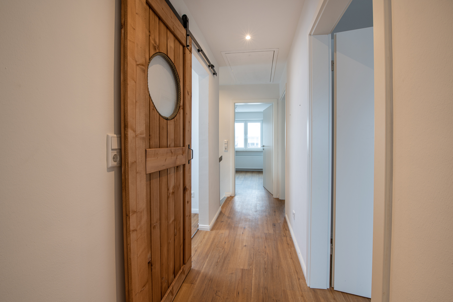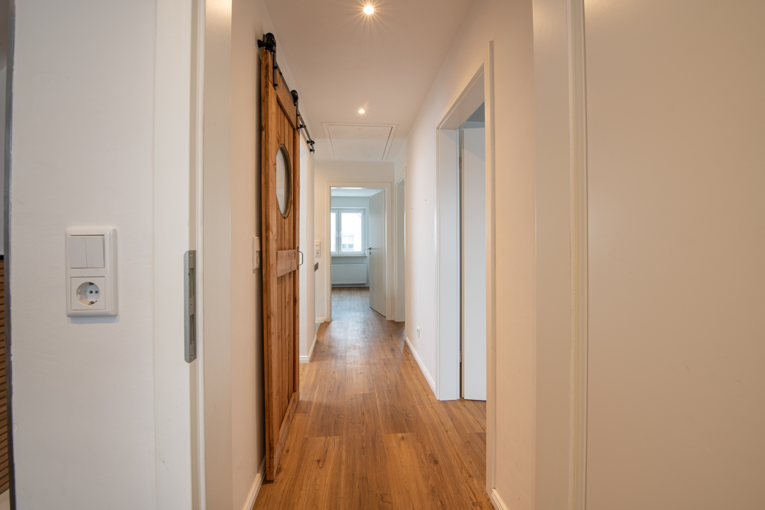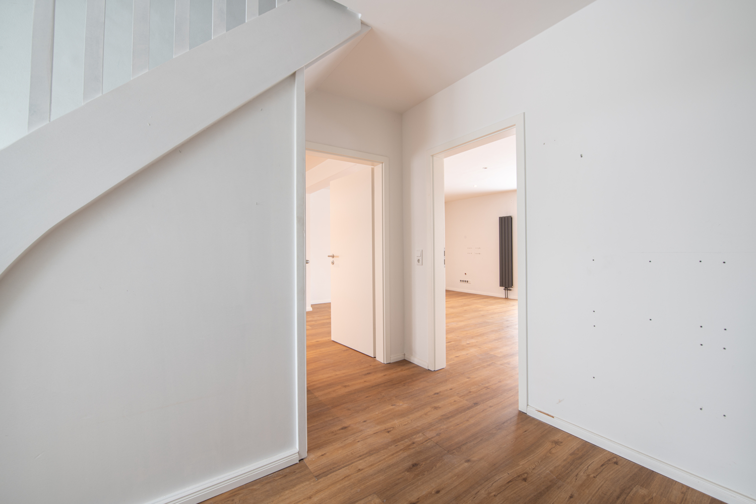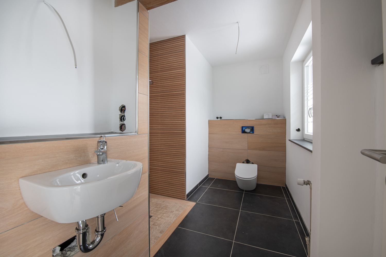 Angekommen im Eingangsbereich des Erdgeschosses freuen Sie sich einmal mehr an dem vielen Licht, dass aus allen Luken ins Haus zu strömen scheint. Der Flur ist geräumig und bietet neuerdings direkt neben der Haupteingangstür direkt zur Rechten ein vollwertiges Badezimmer (Baujahr 2025/26) mit Waschtisch, Dusche und Toilette.