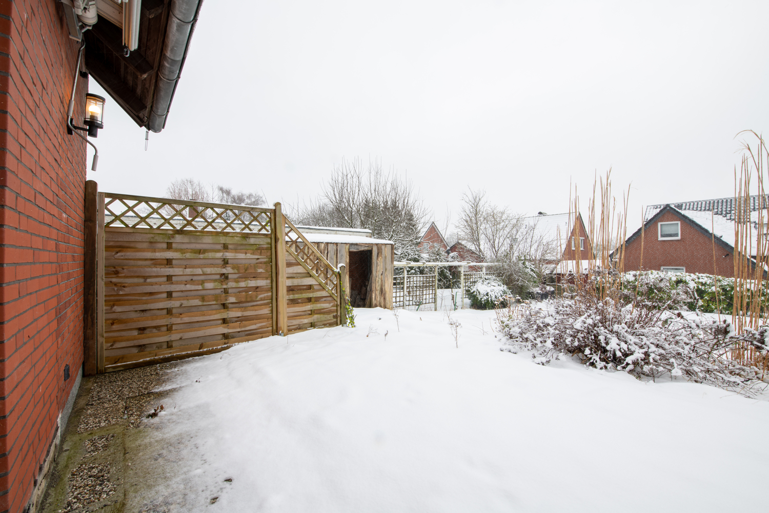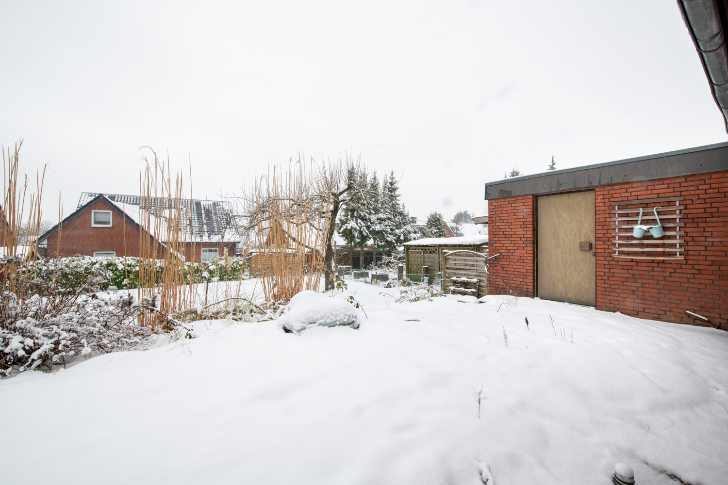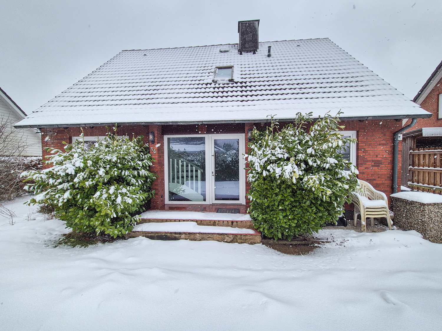 Ihre Einkäufe bringen Sie von hier aus bequem die (aktuell noch provisorischen) 3 Stufen hinauf ins Haus. Ganz nach dänischem Bryggers-Vorbild geht es hier zunächst durch die kleine feine Waschküche mit Optionen zur Unterbringung z. B. einer Garderobe oder eines Regalsystems um Ihren neuen Wasch-Trockner-Turm herum. Die Seiteneingangstür als „Klönschnacktür“ lässt sich im oberen Bereich öffnen.