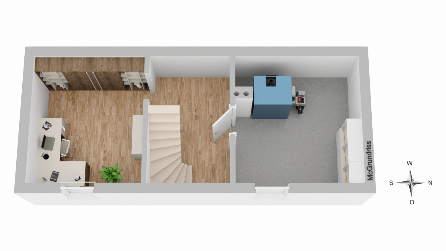 Von hier aus gelangen Sie eine Treppe tiefer in die Teilunterkellerung des Hauses, die bislang auch ein kleines beheiztes Büro (Nutzfläche), einen Flur und den Heizraum beinhaltete. Der Heizraum ist aufgrund des Anschlusses ans regionale Fernwärmenetz der Stadt Flensburg mittlerweile etwas überdimensioniert aber den dadurch freigewordenen Platz können Sie natürlich auch anderweitig gut gebrauchen. Insgesamt ist der Keller sehr gut nutzbar für z. B. weitere Kühl- oder Gefrierschränke, offene Regalsysteme zur Vorratshaltung oder zur Einrichtung eines Weinkellers. Selbstverständlich können Sie den beheizten Raum auch weiterhin als Büro/Homeoffice nutzen.