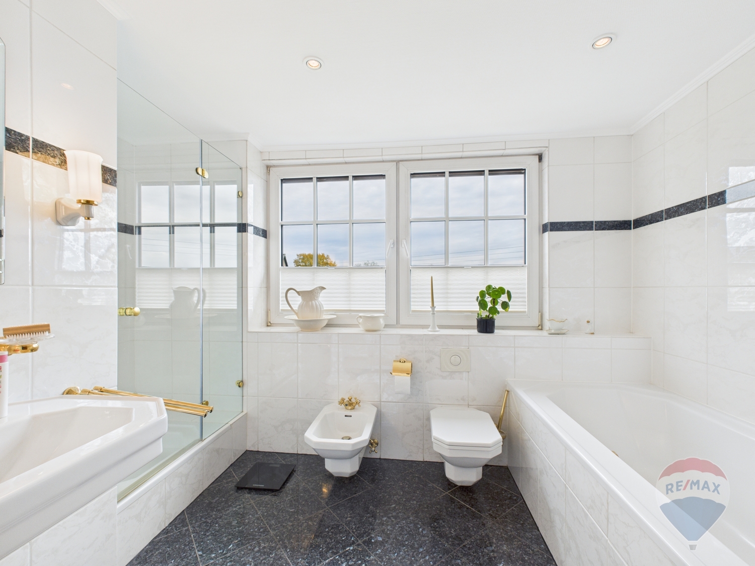-Hauptbadezimmer im 1.OG (Tageslichtbad im 1930 Stil) mit hochwertiger Armaturen, getrennter Badewanne und Dusche, sowie Boden aus schwarzem Marmor