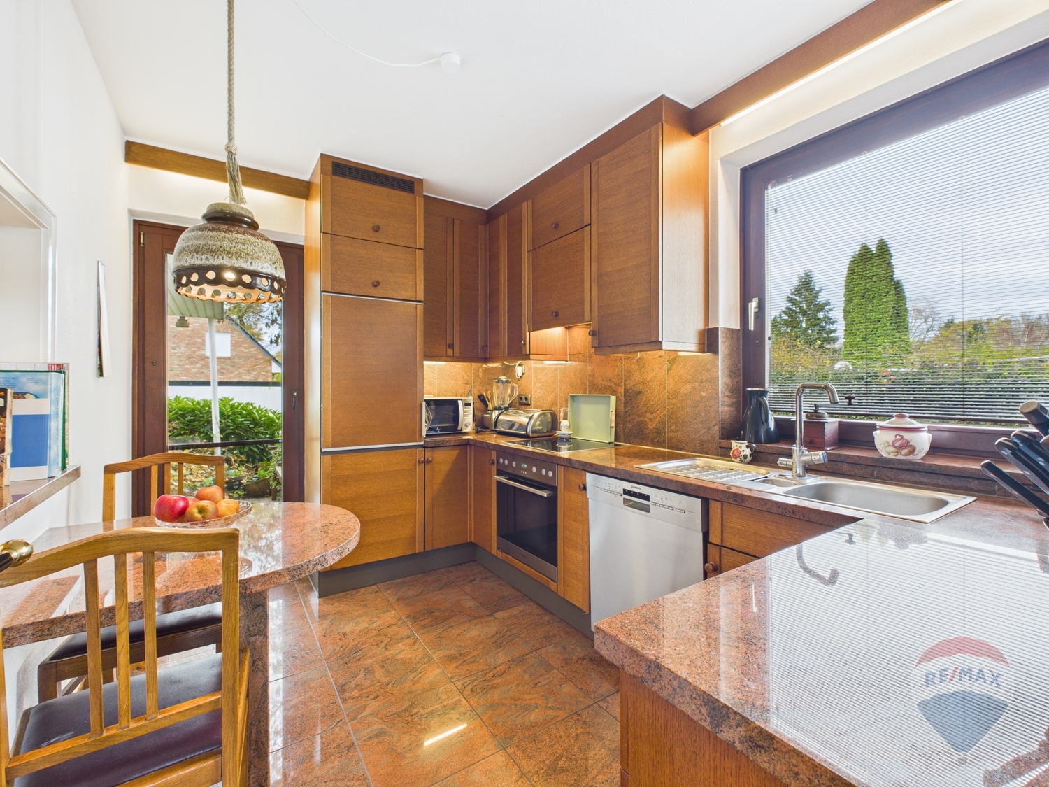 -Einbauküche mit hochwertiger Granitarbeitsplatte inkl. E-Geräte + Zugang zur Terrasse + Durchreiche