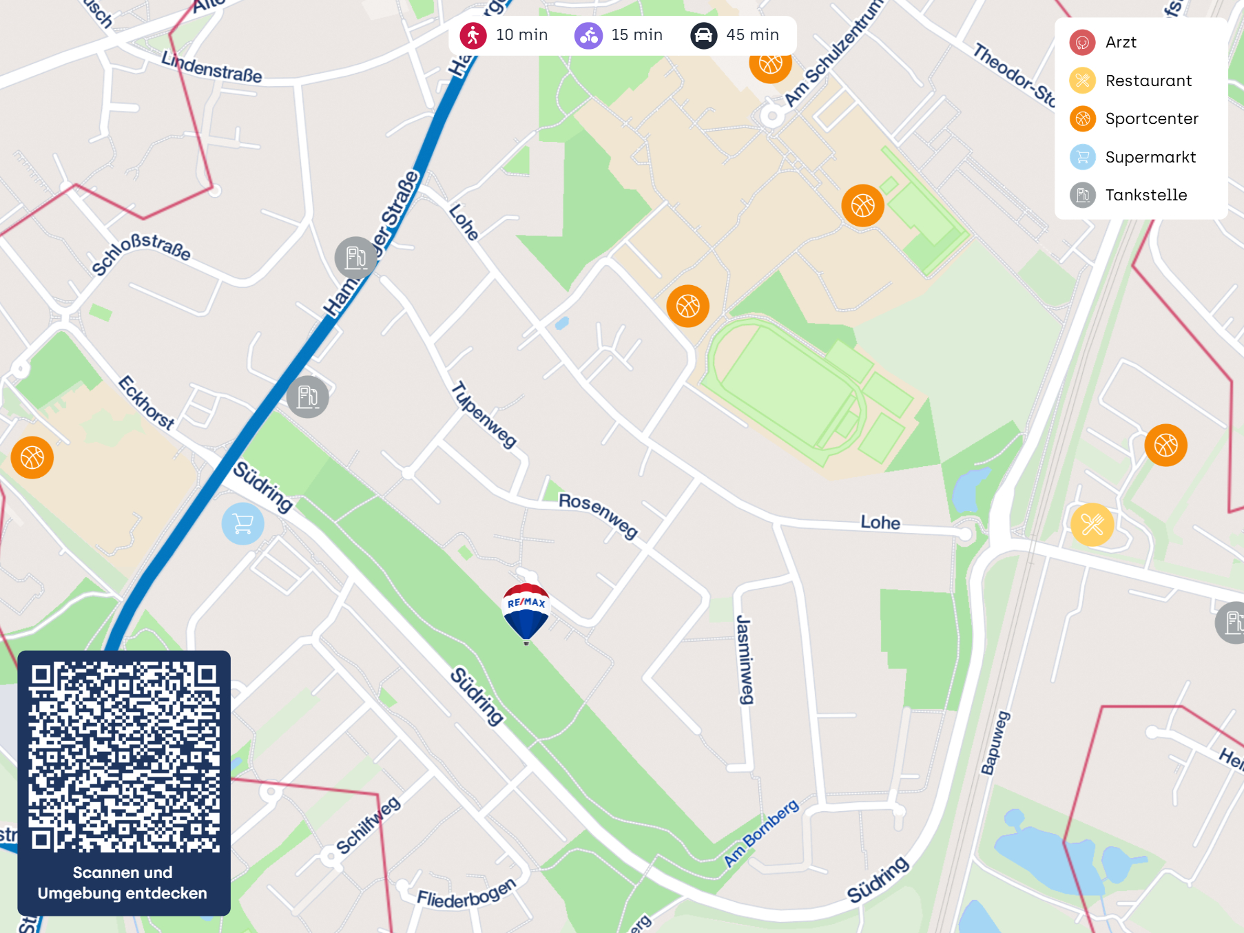Die Anbindung an den öffentlichen Nahverkehr ist hervorragend. Eine Bushaltestelle befindet sich in der Nähe, und die Autobahn ist ebenfalls schnell erreichbar. Der nächste Flughafen, Hamburg Airport, ist ca. 30 Kilometer entfernt und bietet Ihnen eine gute Anbindung für nationale und internationale Reisen.